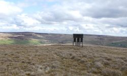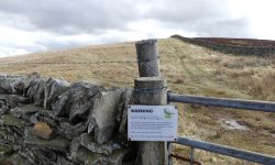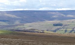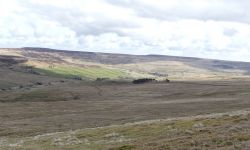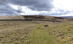 - From the footpath marker follow the farm track north between the converging wall on the left and the fence on the right. Pass through the gate and turn right along the wall, now through old workings. Continue left of a crumbled wall with sweeping views down to the Middlehope valley below. 200 yards before the cross wall ahead turn right for 150 yards across boggy ground to cross a wooden hurdle to the right of a wall corner.